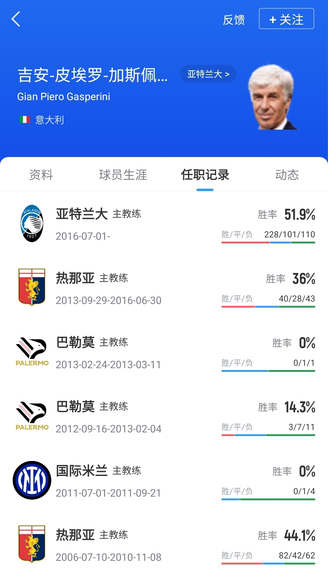加斯佩里尼从2016年开始执教亚特兰大,9年之间战绩228胜101平110负,期间带队夺得过23/24赛季欧联杯的冠军。